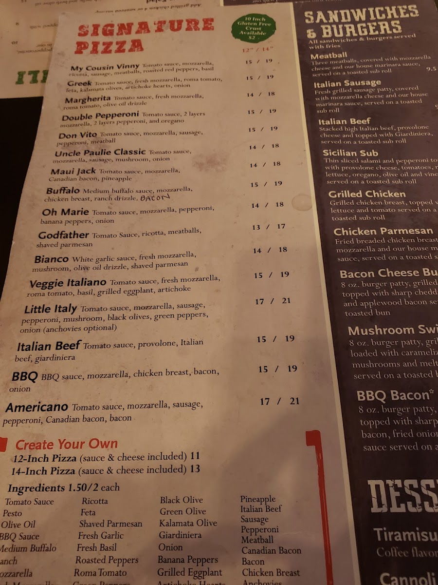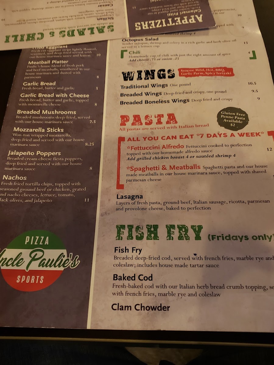 The menu features familiar favorites like traditional wings, mac and cheese, and crispy breaded mushrooms, alongside hearty options such as the Mushroom Swiss Burger with tots or BBQ Pulled Pork Mac N Cheese. For pizza lovers, there’s an array of choices from Uncle Paulie’s Classic to sausage and mushroom varieties, plus “all you can eat” pizza nights that add a fun, communal touch to the experience.